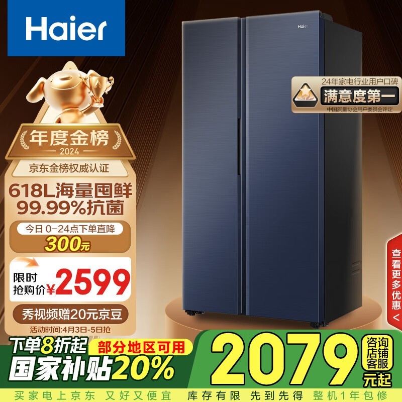 海尔星蕴618L对开门冰箱促销仅1822元到手