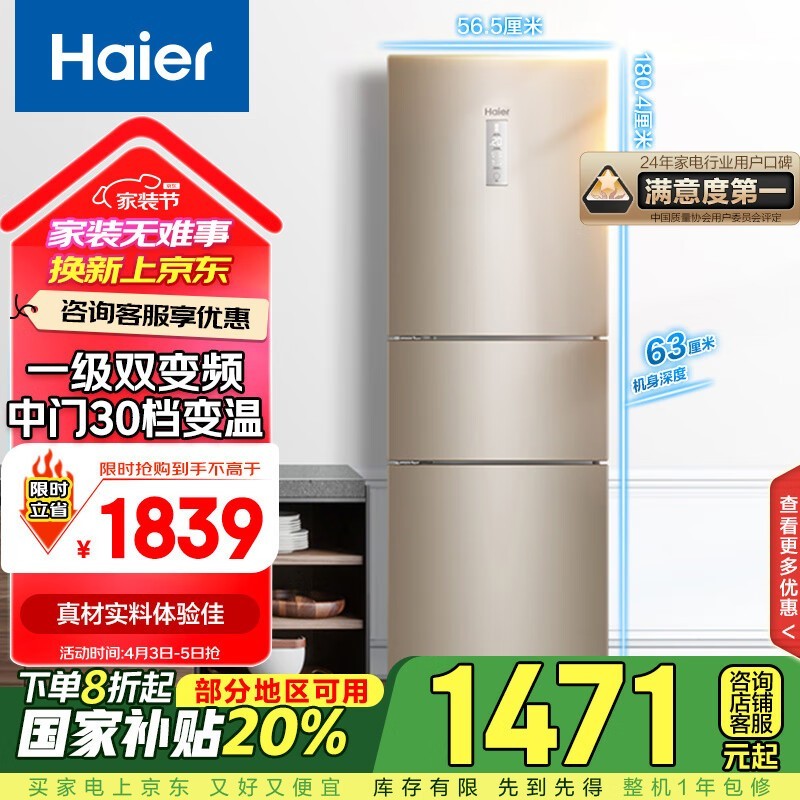 海尔BCD-223WDPT风冷三门冰箱金色223L大容量促销