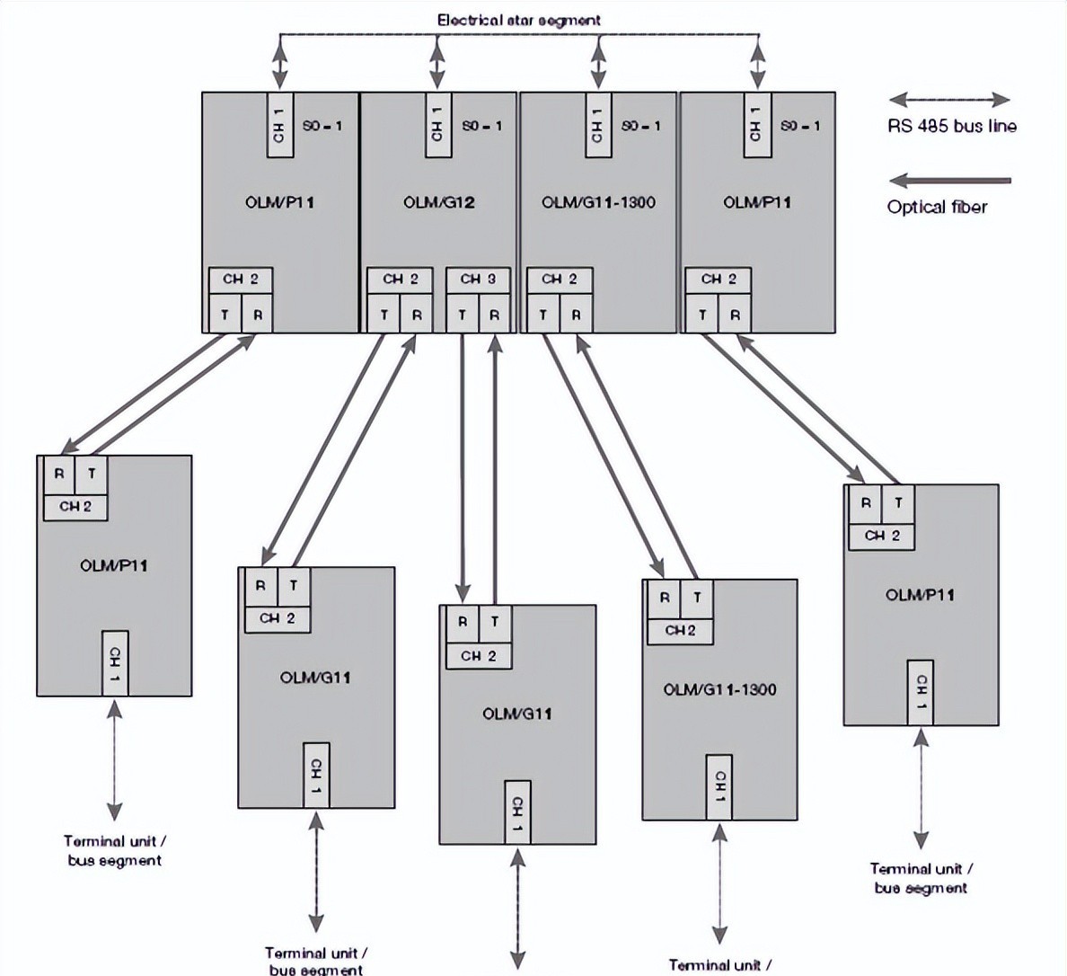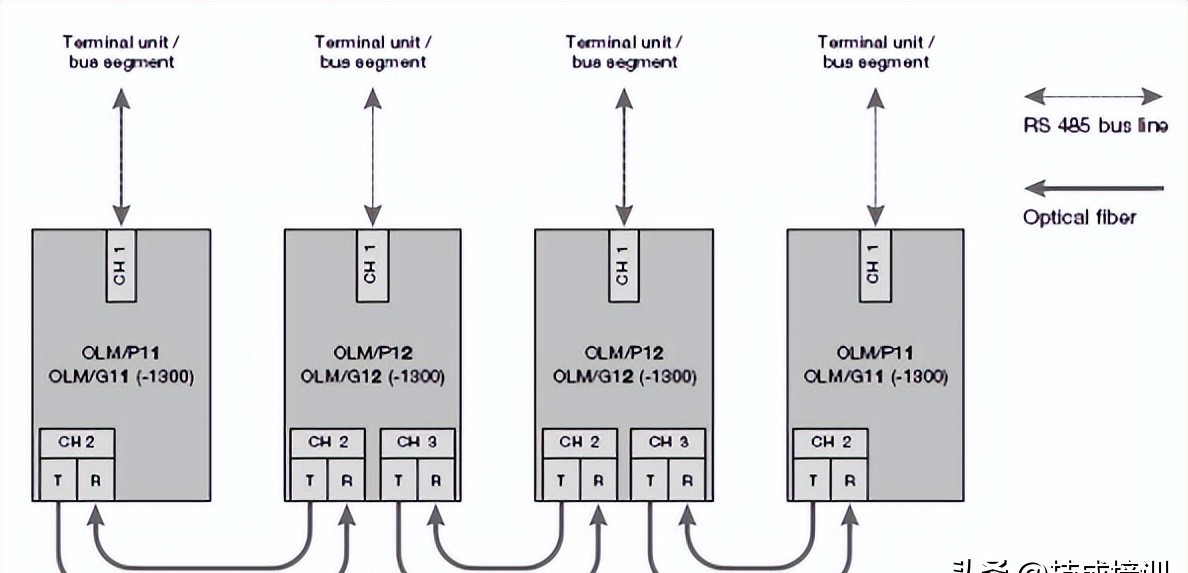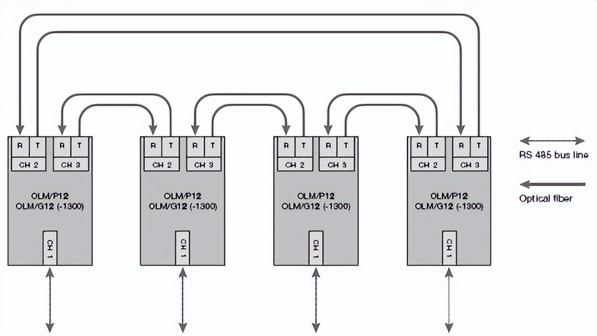 星形拓扑: 不同型号OLM可以混用,但CH1必须设置为“Monitor off”,防止RS485端口被分割,保证网络可用性。未使用光纤端口不应设置监视功能,网线要接牢固,避免干扰。