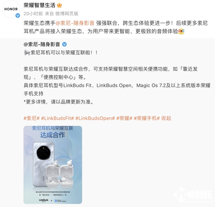 荣耀智慧生活官微表示后续将会有更多索尼耳机产品将接入荣耀生态,为用户带来更智能、更极致的音频体验。
