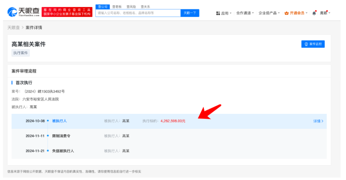 天眼查App显示,高静静曾涉及与安徽锦晨文化传媒有限公司的合同纠纷案件。案件流程信息显示,高静静曾因此案于去年10月被执行426万余元,去年11月被列为失信被执行人,并被限制高消费。