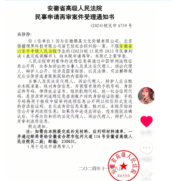“刀小刀”表示,合同签订33天,男友提出索要1700万违约金。因单⽅提前解约,经法院多次审理,最终判赔442万元。“刀小刀”称她已向安徽省高院申请再审,已获受理,并对外展示了法律文书。