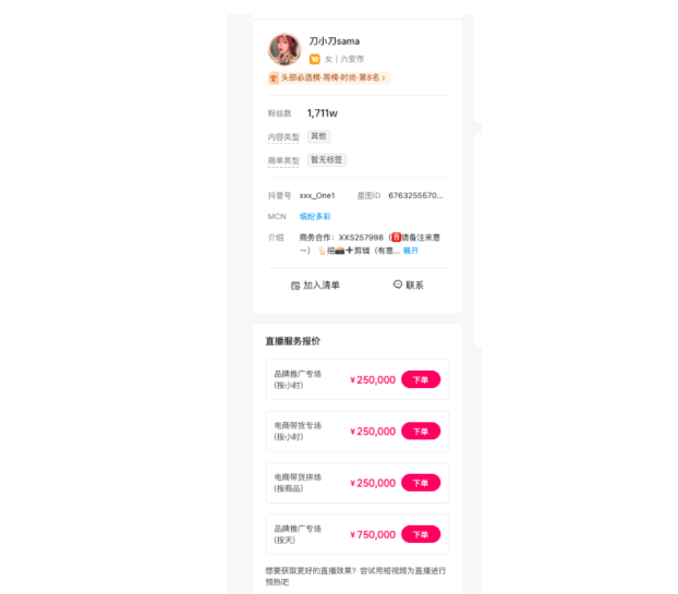 记者查询巨量星图发现,“刀小刀”一场品牌推广直播报价25万元,品牌推广专场一天75万元。另外一条广告报价也高达30万元。