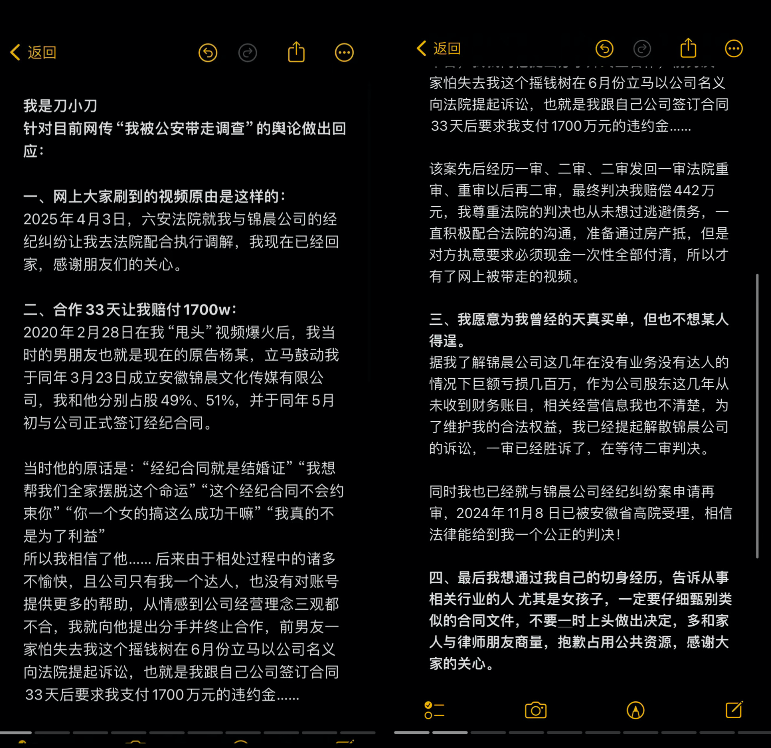今日凌晨,“刀小刀”在抖音回应了被带走一事,她表示,此次是去法院配合调解执行与锦晨公司的经纪合同纠纷,现已回家。