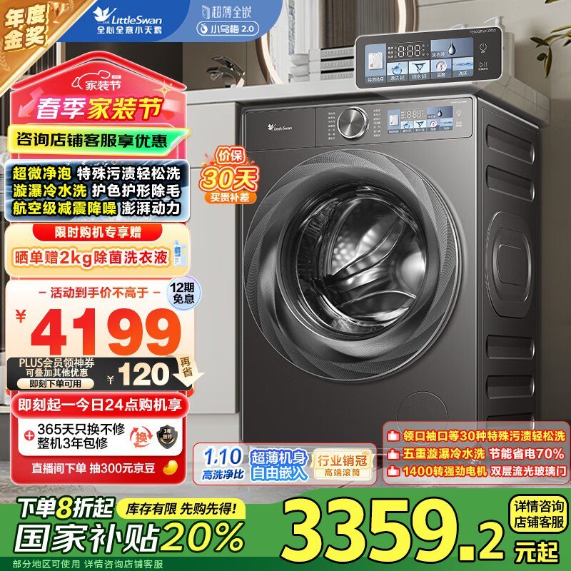 小天鹅全自动滚筒洗衣机10kg大容量仅2737元