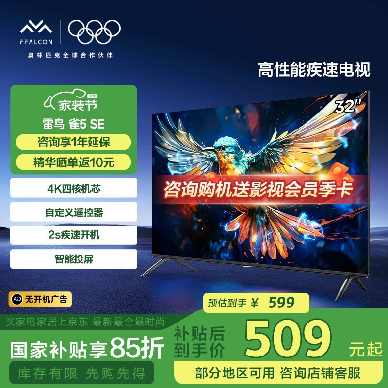 雷鸟32英寸雀5SE智能电视,优惠后491元