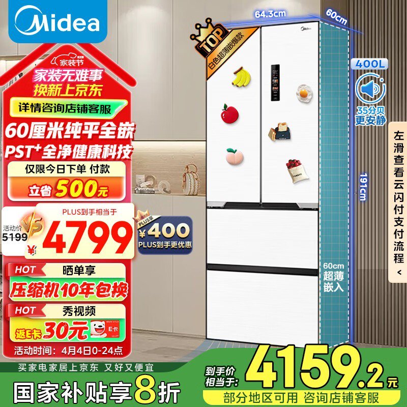 美的MR-421WUFPZE法式多门冰箱超薄嵌入式设计仅3184元