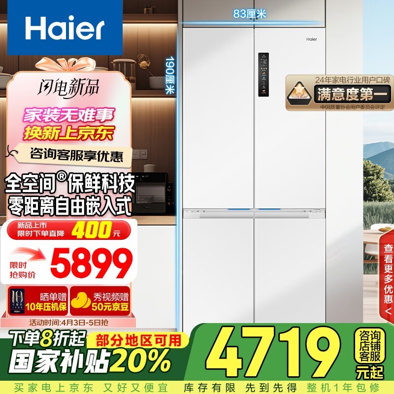 海尔506L风冷十字对开门冰箱仅4354元