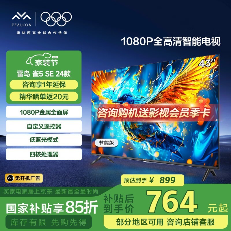 雷鸟43英寸全高清智能液晶电视雀5SE节能版促销