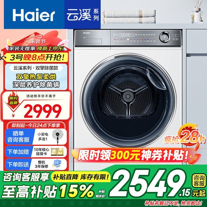 海尔云溪白滚筒烘干机10kg大容量智能传感技术保护衣物纤维