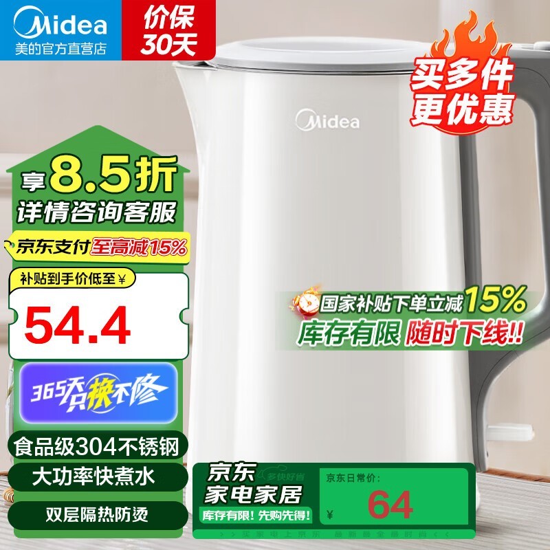 美的HJ1566电热水壶1.5L大容量京东到手仅45.9元
