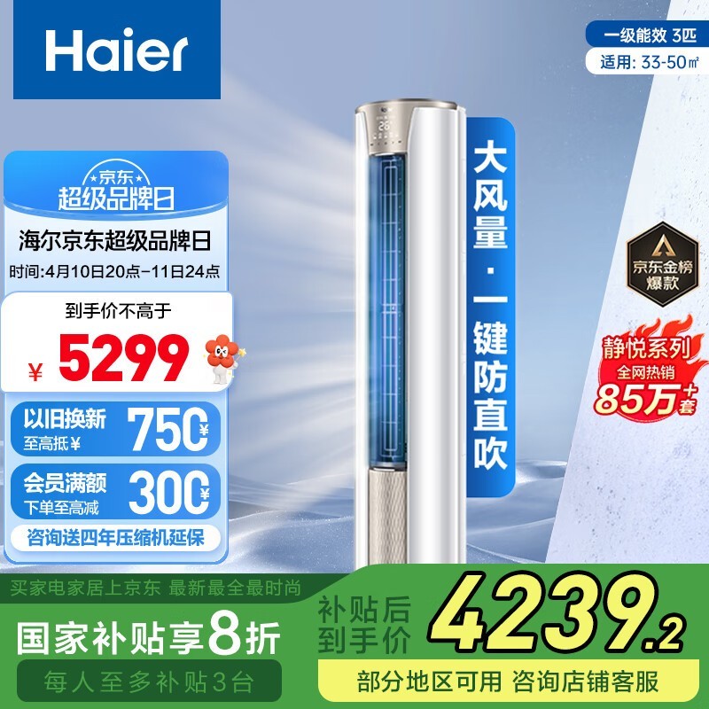 海尔静悦3匹立柜式空调促销,原价5299现3593.49