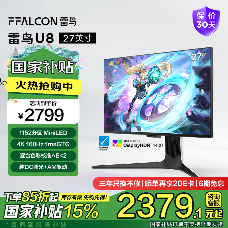 雷鸟U8 27英寸4K电竞显示器160Hz刷新率仅2367元