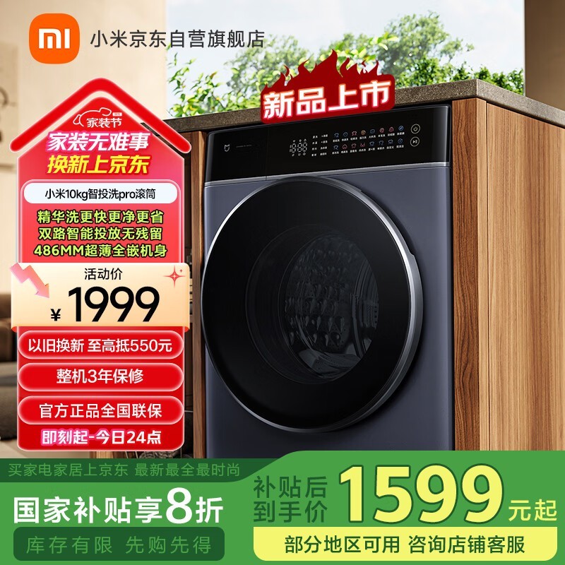 米家10公斤智投滚筒洗衣机1599元促销