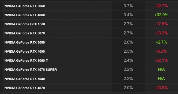 榜单显示,RTX 3060以3.7%的份额位列第一。该卡自2021年发布以来,常年占据Steam显卡使用率榜首,占比超过5%。