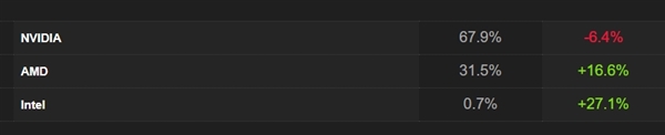 不过从品牌受欢迎程度来看,NVIDIA在一年内失去了6.4%的市场份额,现在为67.9%。而AMD在一年内增长了16.6%,目前提升到了31.1%。
