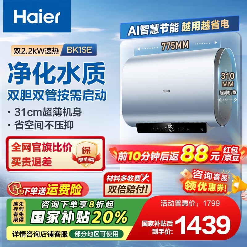 海尔60L纤薄双胆电热水器京东优惠价1095元