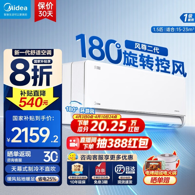 美的风尊二代空调1.5匹新一级能效省电舒适兼得