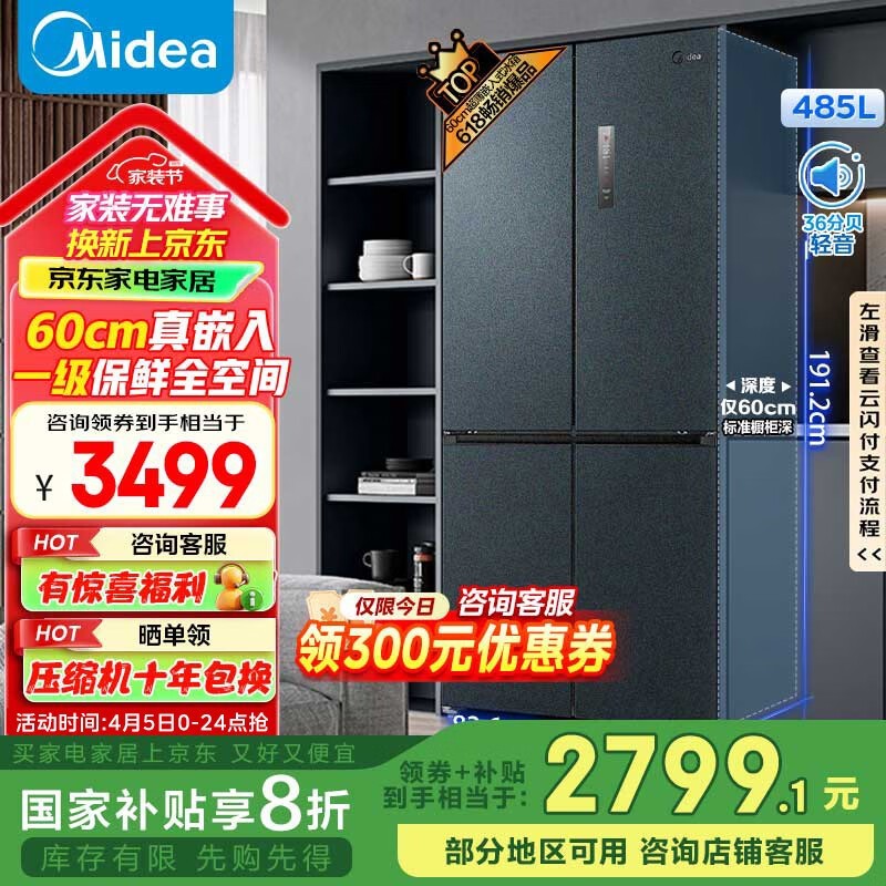 美的485L十字对开门冰箱薄至60cm嵌入式设计仅3499元