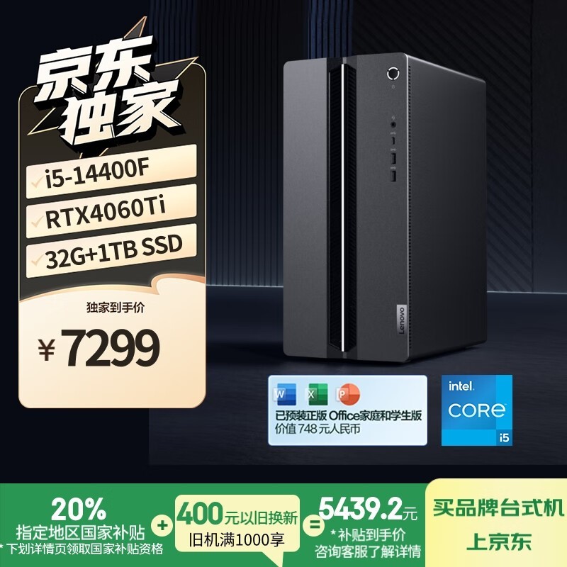 联想GeekPro游戏台式机i5-14400F/32G/1TB/RTX4060Ti