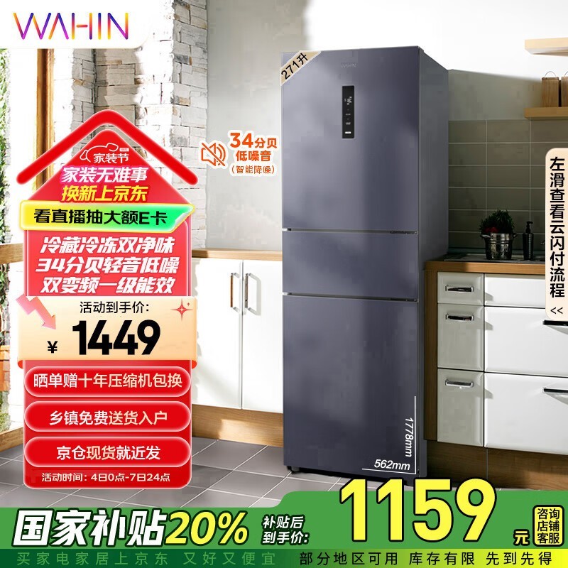 华凌美的282三门冰箱京东促销价955元
