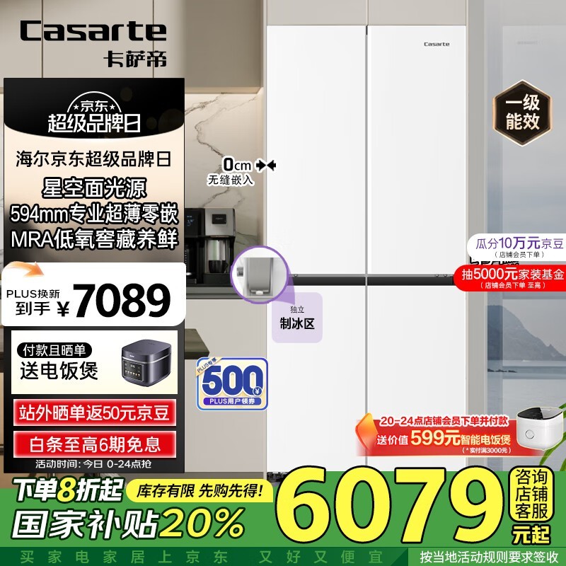 卡萨帝星空477升超薄零嵌十字四开门冰箱低至4876元