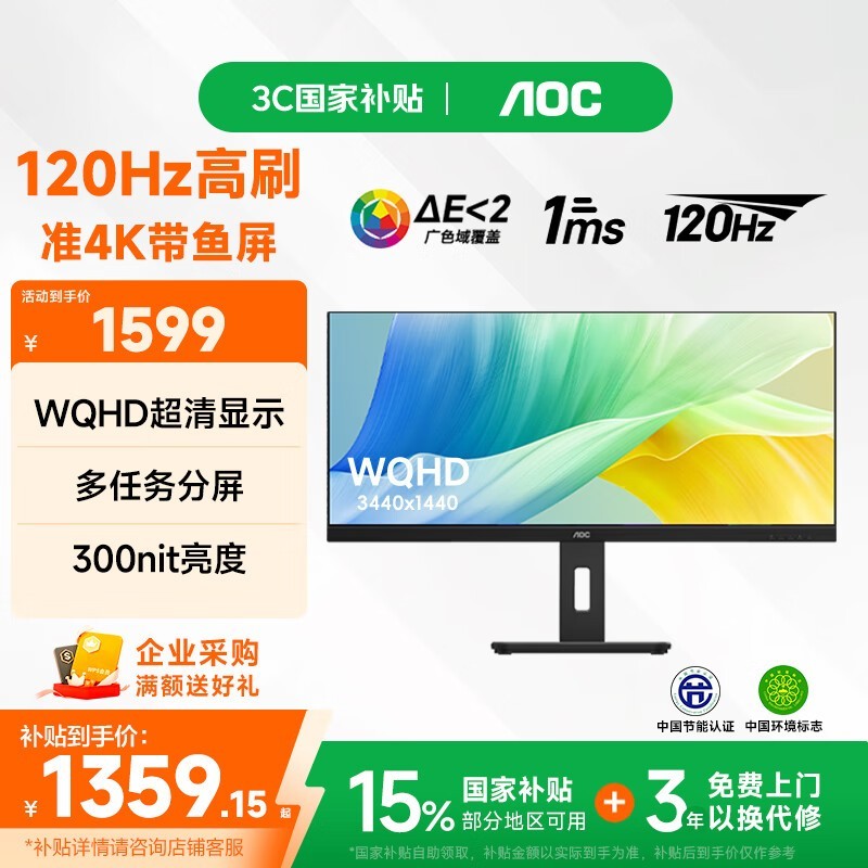 AOC U34E2M显示器京东特惠仅1352元享国补15%