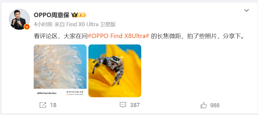中关村在线消息:今天上午,OPPOFind系列产品负责人周意保在微博上公布了OPPO Find X8 Ultra的一项重要特性,其长焦镜头支持长焦微距功能。