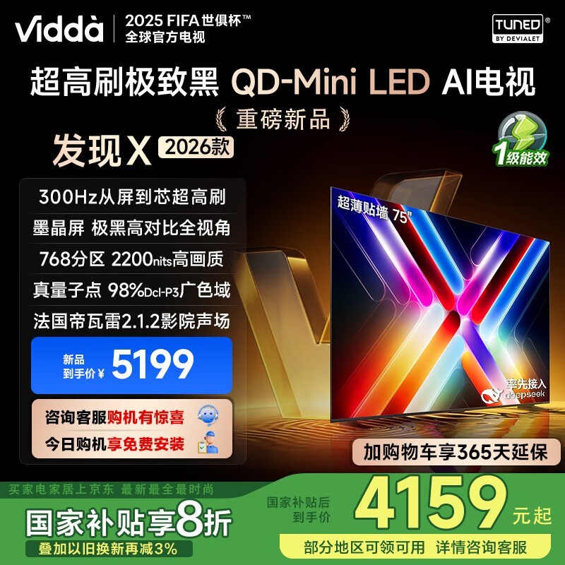 Vidda发现X 2026款75英寸QD-Mini LED电视300Hz刷新京东好价4142元