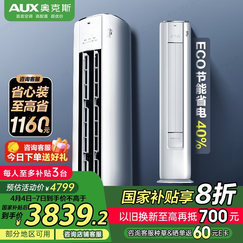 奥克斯3匹省电侠立柜式空调新一级能效大空间舒适体验