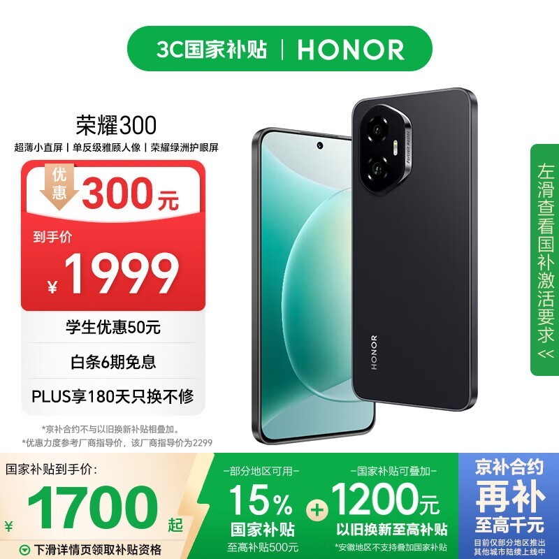 荣耀HONOR 300 5G手机墨岩黑8GB+256GB京东特惠1605元