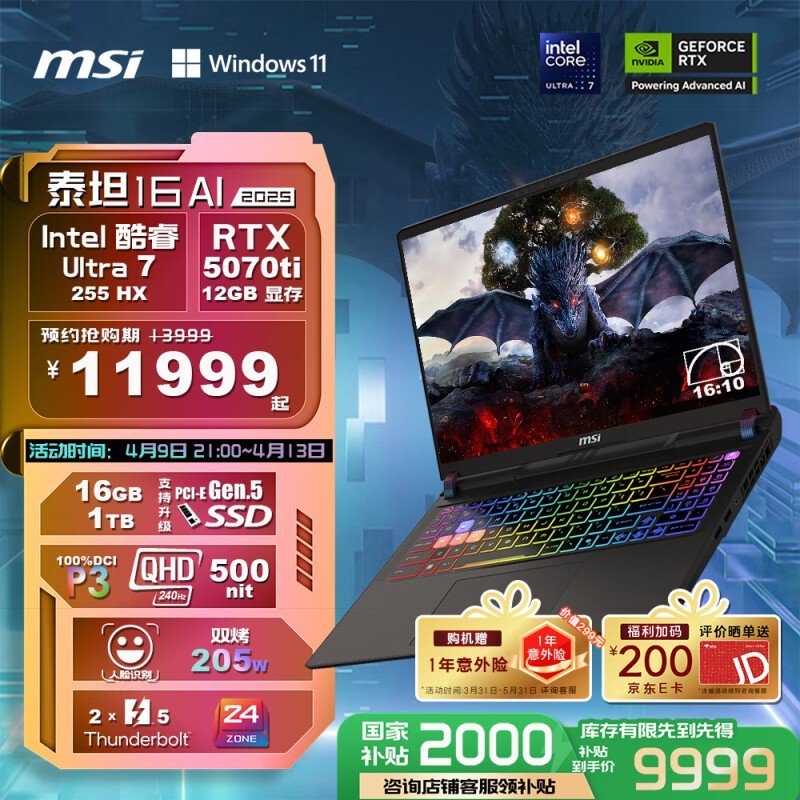 微星泰坦16 AI 2025游戏本京东补贴价9999元