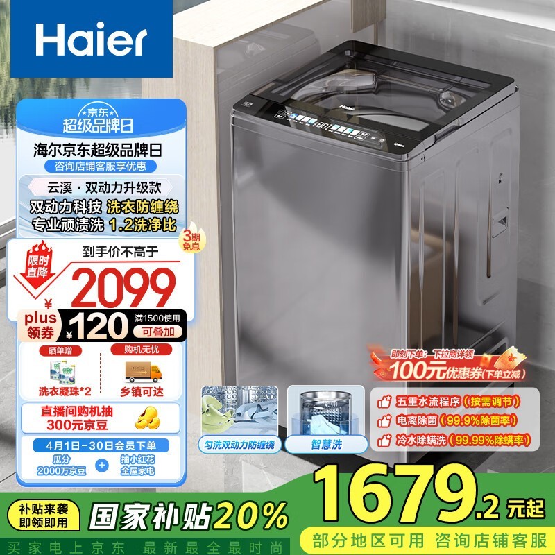 海尔XQS100-BZ659变频洗衣机10kg大容量仅1328元
