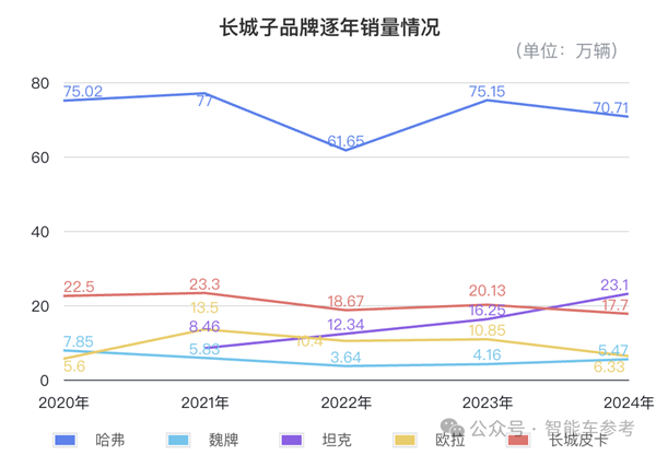 但是其他品牌都在降,比如哈弗同比2023年的71.51万辆下降1.25%;长城皮卡同比上一年下滑12.5%;同比跌幅最大的是欧拉,41.69%: