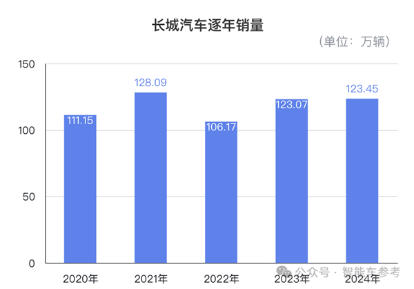 比较来看,长城汽车2024年全年汽车销量为123.45万辆,同比2023年基本持平,也没有超越2021年128万辆的巅峰数据: