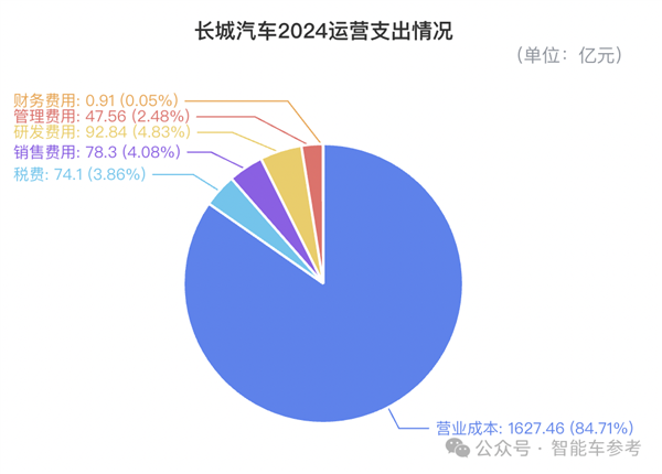 支出层面,2024年长城汽车经营总成本为1921.11亿元,同比增长14.56%。这些是2024年长城花掉的钱,拆分一下包括: