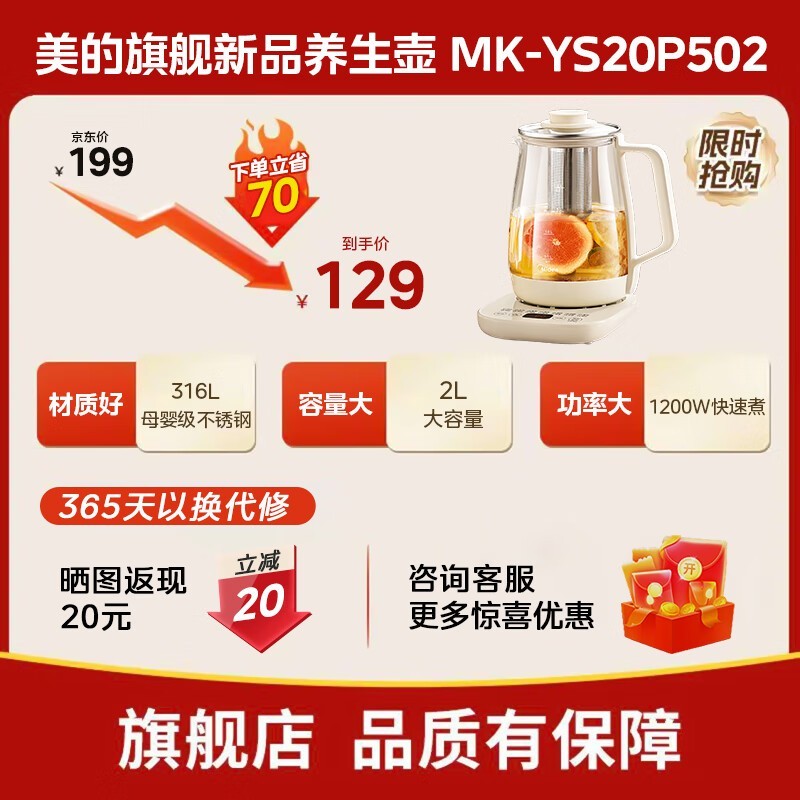 美的养生壶2L大容量精准控温家用电热水壶京东活动价91.15元