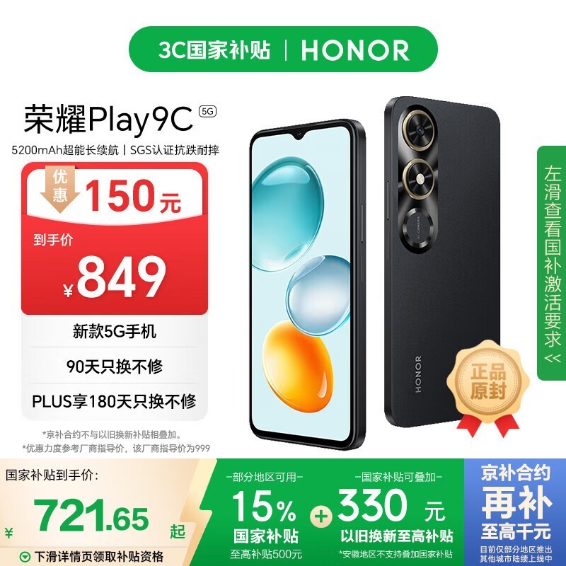 荣耀HONOR Play9C 5G手机8GB+256GB低至789元