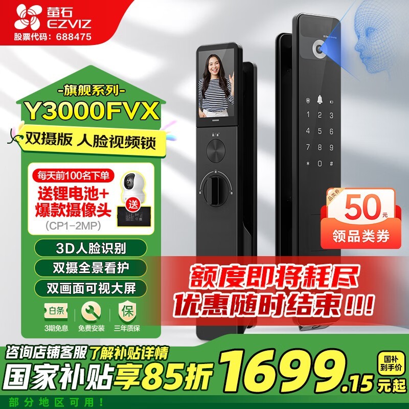 萤石Y3000FVX智能锁静谧黑优惠价1648元