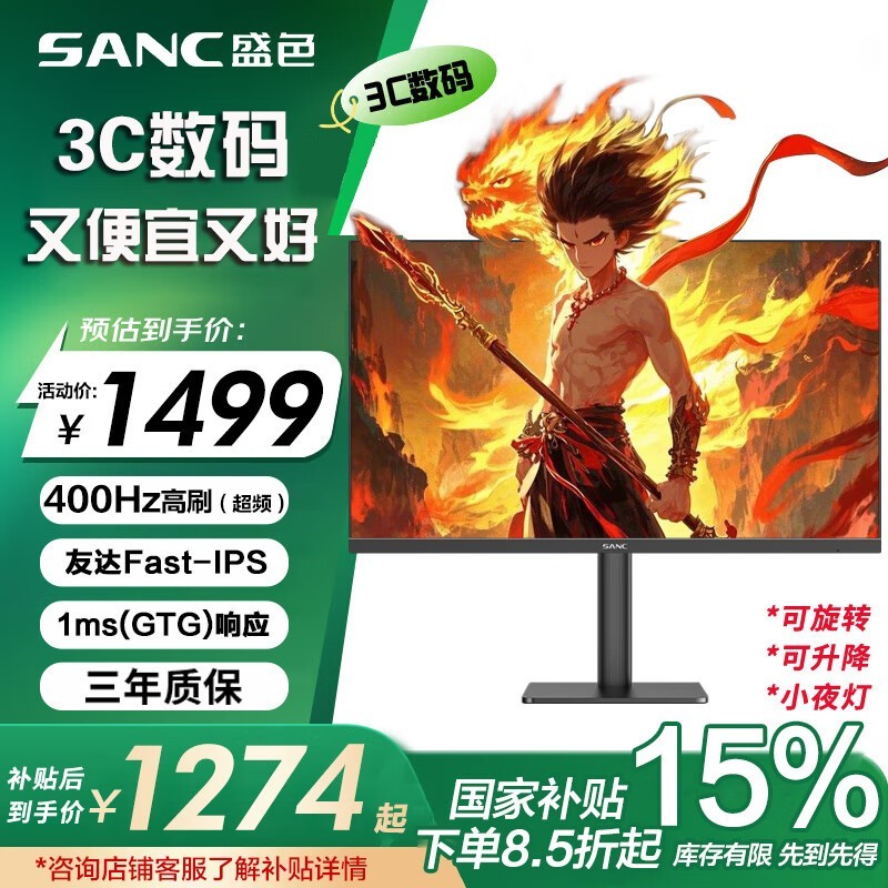 SANC 24.5英寸电竞显示器360Hz京东1274元好价