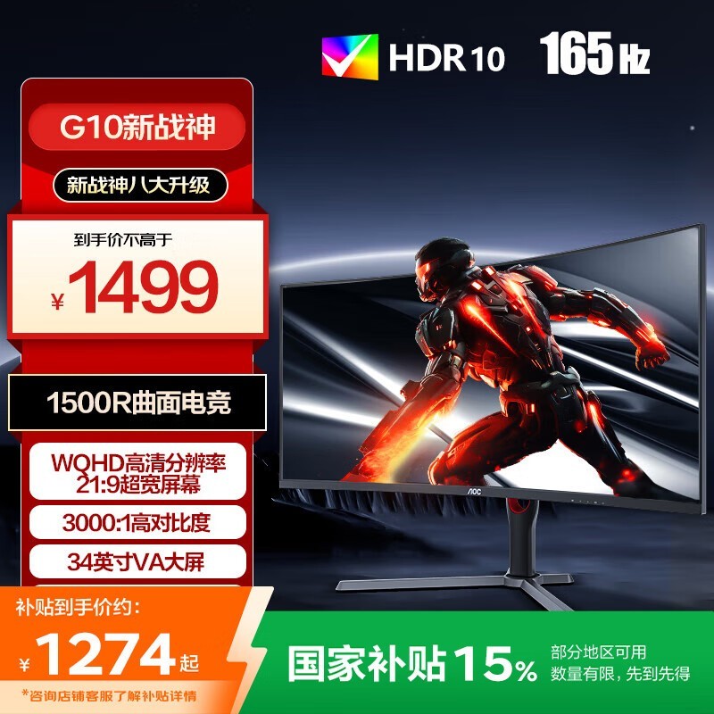 AOC 34英寸显示器165Hz高刷准4K带鱼屏仅1267元