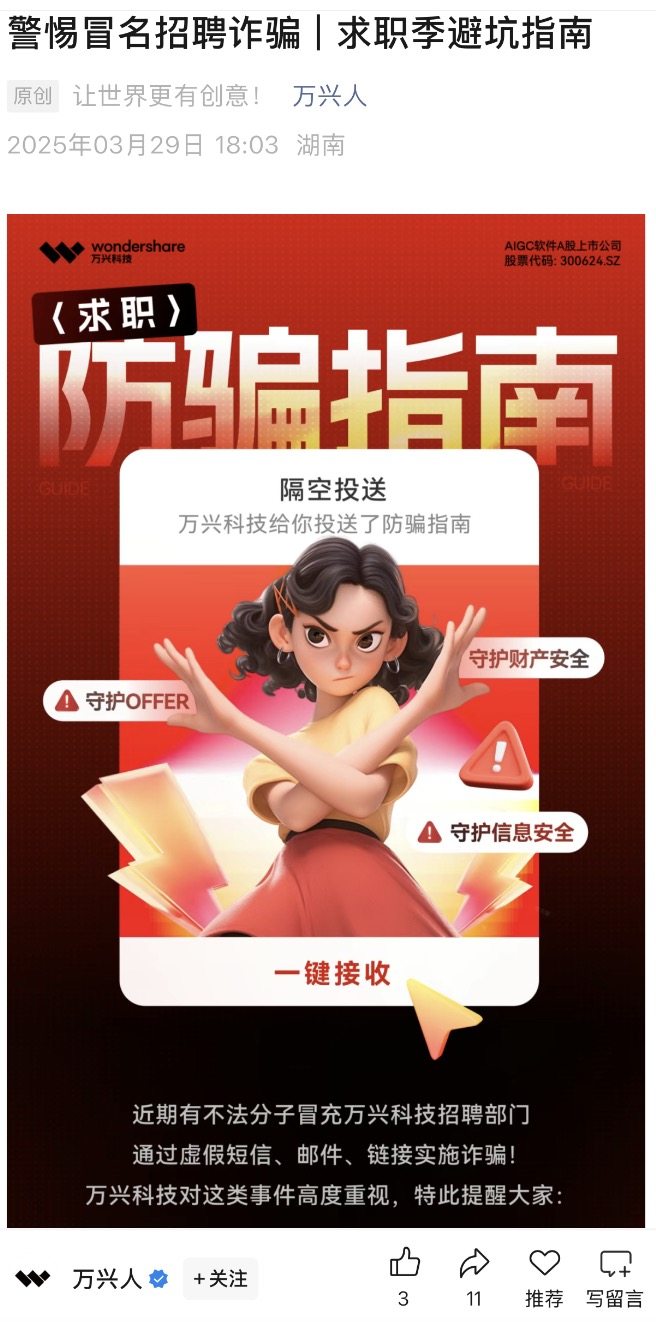 日前,A股上市公司万兴科技官方账号发文警惕冒名招聘诈骗。官方提醒称,近期有不法分子冒充万兴科技招聘部门,通过虚假短信、邮件、链接实施诈骗。若遇短信/邮件邀请投递岗位、测评/岗前测试返利、安装下载不明软件等情况,100%是骗局。