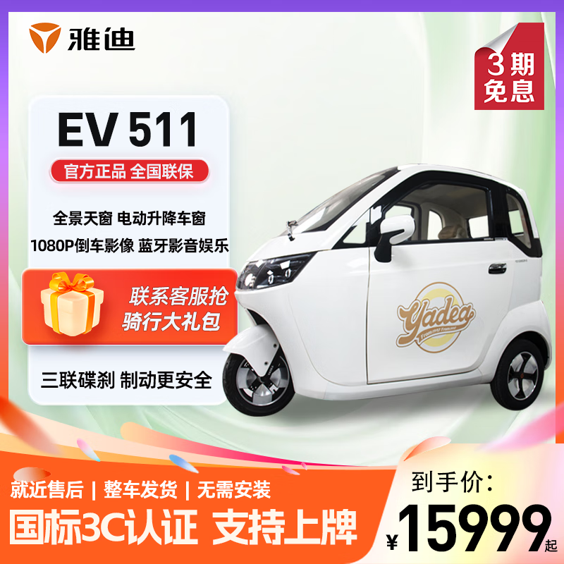 雅迪EV301全封闭电动三轮车珠光白58A电池家庭专用