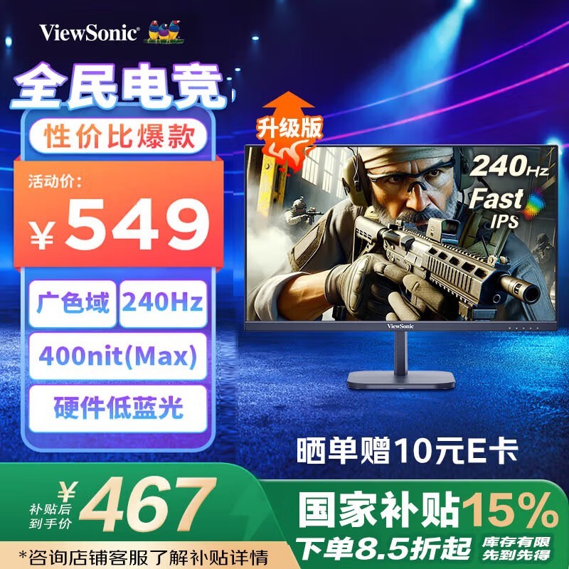 优派VX24G10电竞显示器240Hz刷新率仅454元