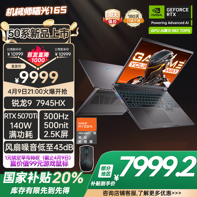 机械师曙光16S游戏本RTX4070Ti京东国补20%仅7999元