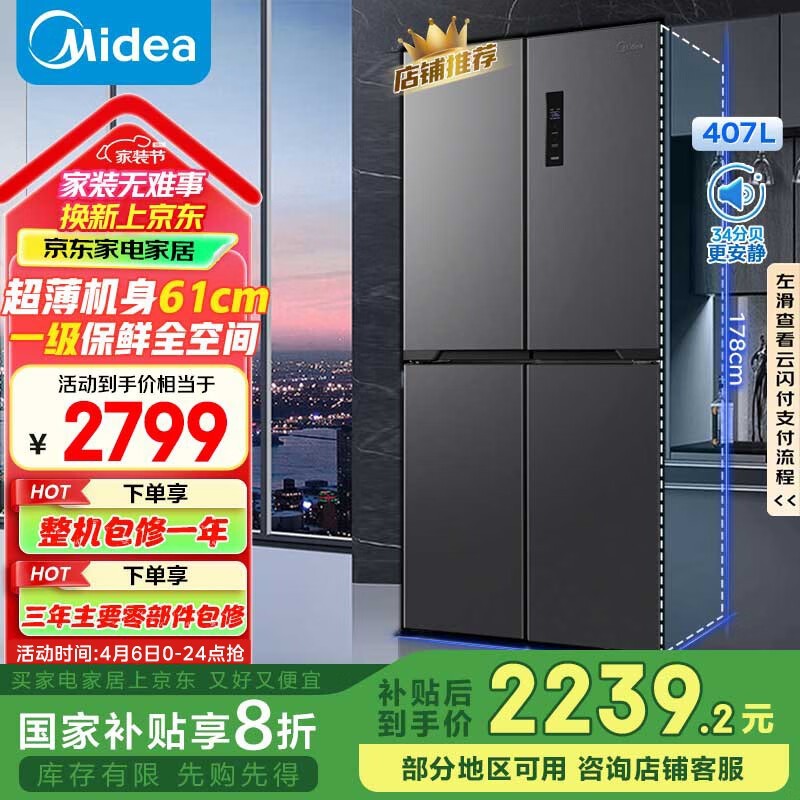 美的BCD-407WSPZM(E)四开门电冰箱薄机身大容量促销