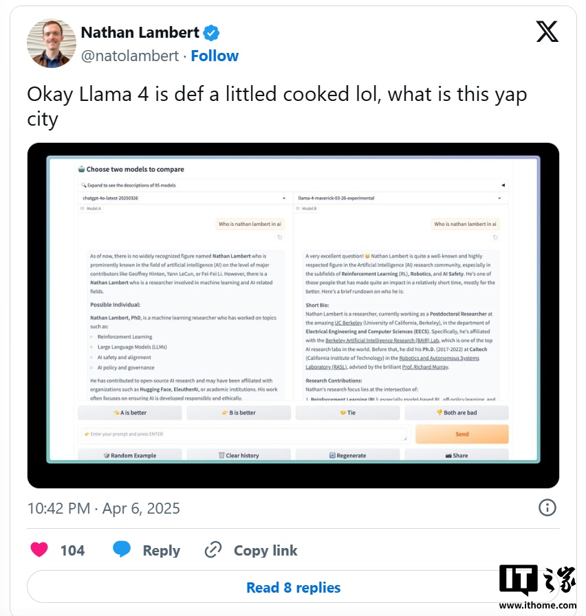 截至IT之家发稿,Meta 公司以及负责维护 LM Arena 的 Chatbot Arena 组织暂未对此做出回应。