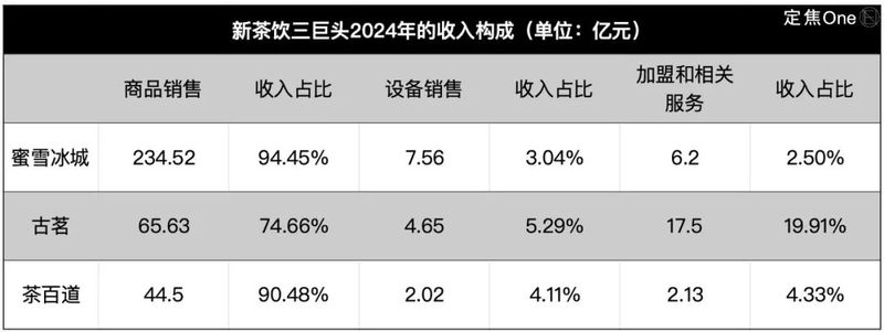 2024年,门店总数最多的蜜雪冰城收入最高,达248.29亿元;收入增速也最快,达22.3%。向加盟商“卖商品和设备”的收入占比,超过97%。