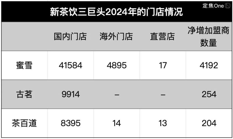 蜜雪冰城(中国内地店)在2022年、2023年和2024年分别新增了7457家、6046家和8350家门店,情况尚好,但另外两家有点开不动了:古茗同期分别新增975家、2332家和913家;茶百道同期分别新增1284家、1440家和594家。