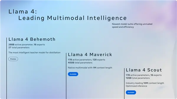 Meta表示,Llama 4是一个多模态大模型,它能够处理和整合各种类型的数据,包括文本、视频、图像和音频,并且可以在这些格式之间转换内容。